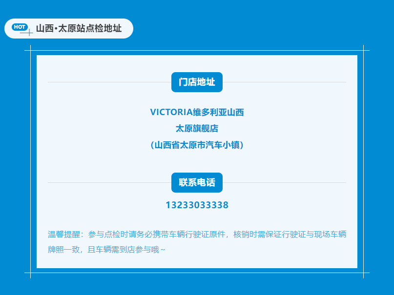 北京站的余温未散,太原站的期待已至!8月2日—3日,维多利亚全国巡回点检将登陆山西太原,带着同样的专业配置,为晋地维蜜车友送上专属福利: