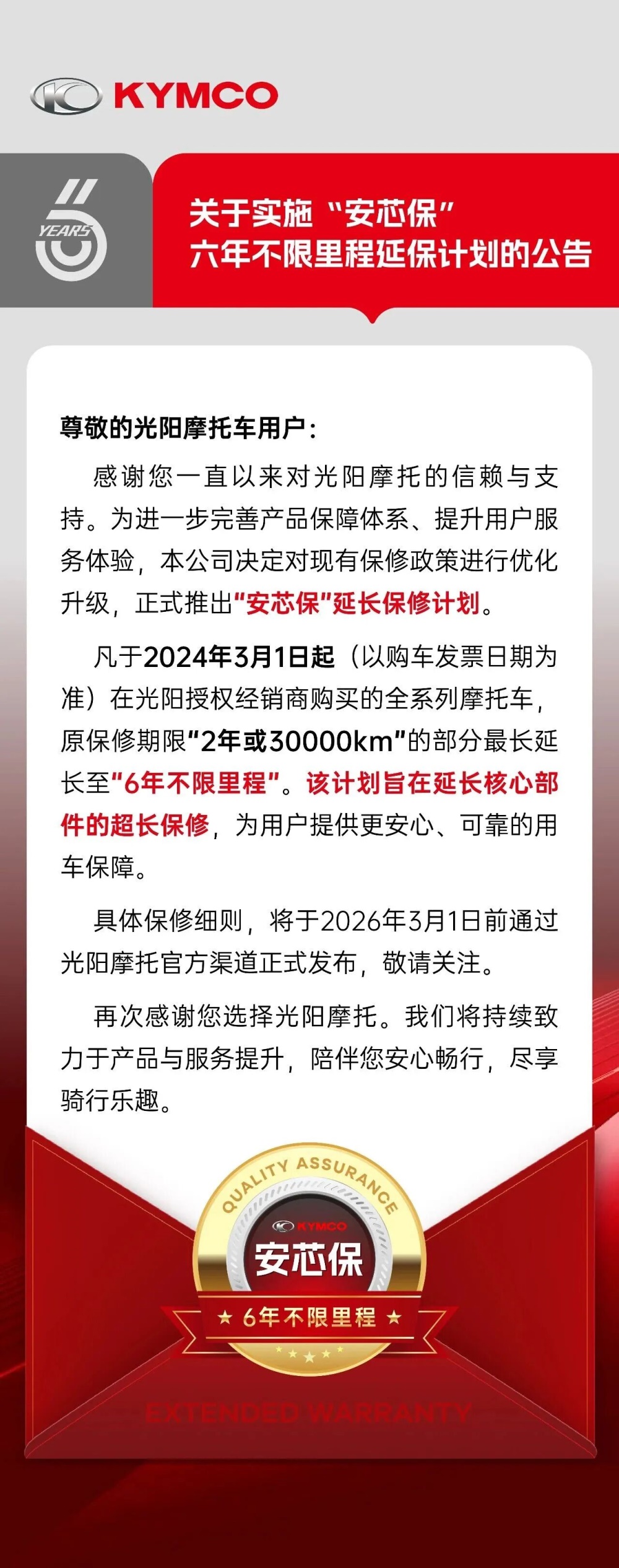 此次延保政策明确,2024年3月1日起(以购车发票日期为准),在光阳授权经销商处购买全系列摩托车的用户,可享受最长“6年不限里程”延保服务,覆盖核心部件,打破原“2年或30000Km”的保修限制,大幅扩大受惠用户范围。同时,该延保支持全国联保,用户在授权经销商处定期保养且保留完整记录,即可持续享受保障,具体细则后续将通过官方渠道发布。
