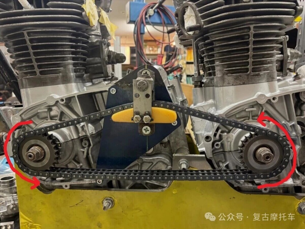 整个联动结构并未使用前机的变速箱,末级动力是由后机小牙盘输出,而XS650的发动机是向前旋转的(箭头向)。