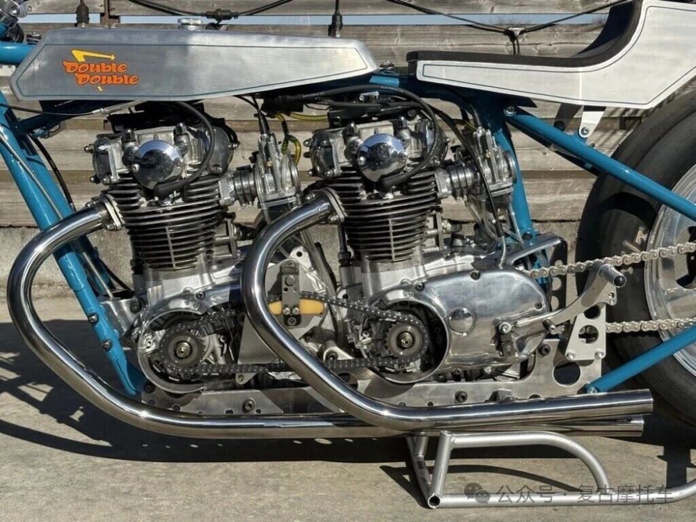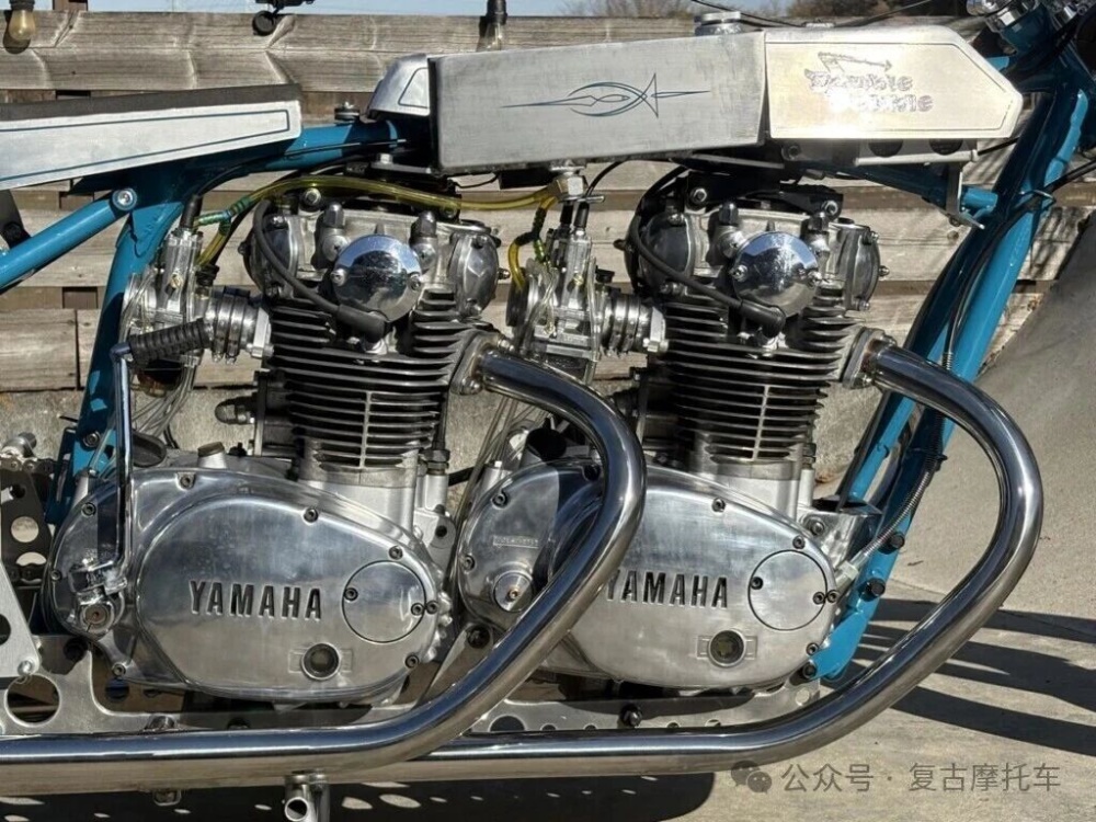 这部车上最有意思的改装细节无疑是两台连接为一体的发动机,这两台XS650发动机先是将左侧磁电机移除,然后又通过在曲轴上安装链轮和配套链条实现了双机联动,而双机的动力则由后机的变速箱变速后,最终传递给后轮。