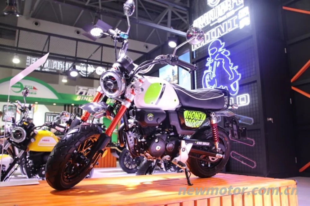 猴子mini蜜獾单缸风冷发动机,最大功率8.2Kw,最大扭矩11.5N.m,时速最高90KM。