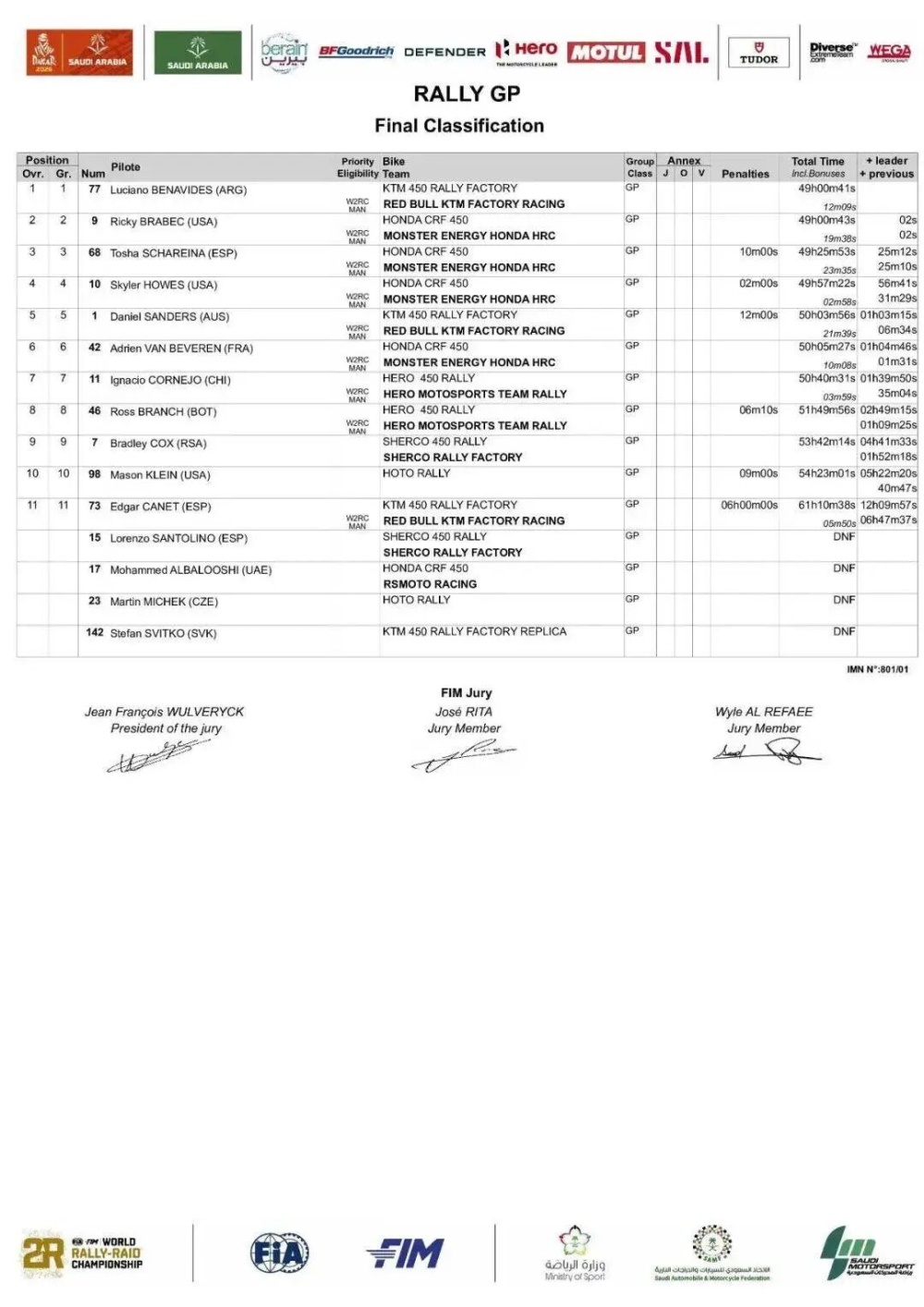 2026年达喀尔拉力赛于1月17日在沙特阿拉伯延布落下帷幕。在最具看点、竞争最为惨烈的摩托车组别中,红牛KTM工厂车队的阿根廷车手卢西亚诺·贝纳维德斯以仅仅2秒的微弱优势,领先本田HRC车队的美国名将里奇·布拉贝克,夺得了个人职业生涯的首个达喀尔总冠军,并创造了这项传奇赛事历史上冠亚军之间的最小时间差纪录。这场胜利也为KTM品牌赢得了其历史上的第21座达喀尔摩托车组总冠军奖杯。