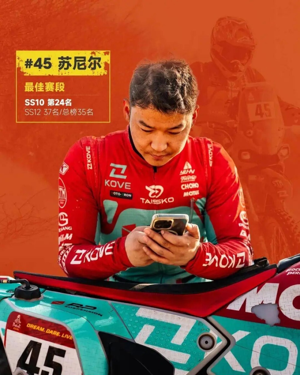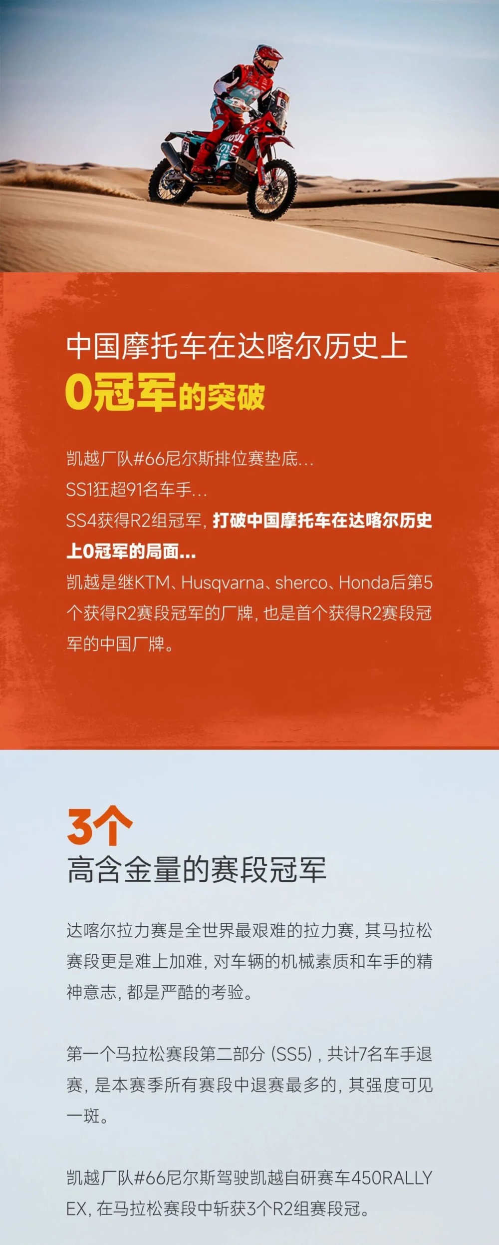 中国车手苏尼尔驾驶凯越450 Rally EX赛车顺利完赛,在Rally2组别中位列第24名,总成绩排名第35位,刷新了个人在达喀尔的最佳战绩。凯越车队凭借卓越的表现,标志着中国高性能摩托车制造业已正式踏入世界顶级赛场的竞争舞台。
